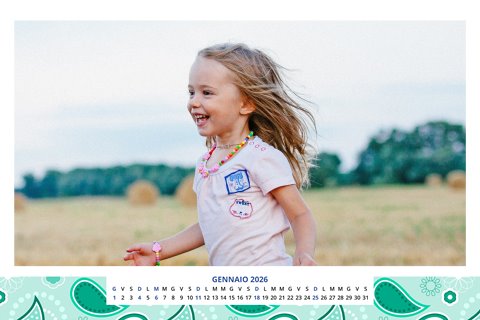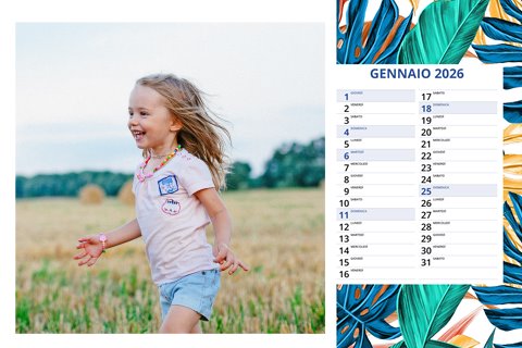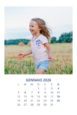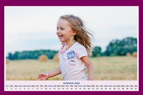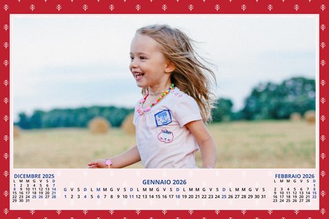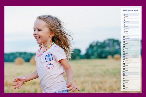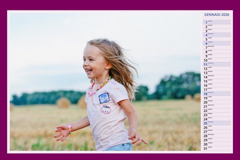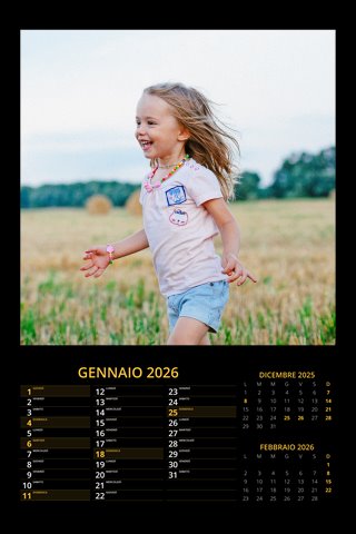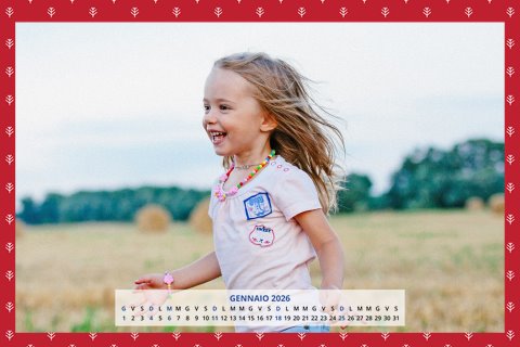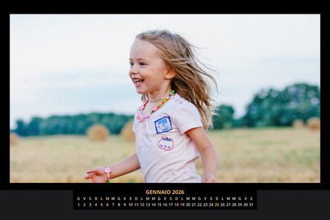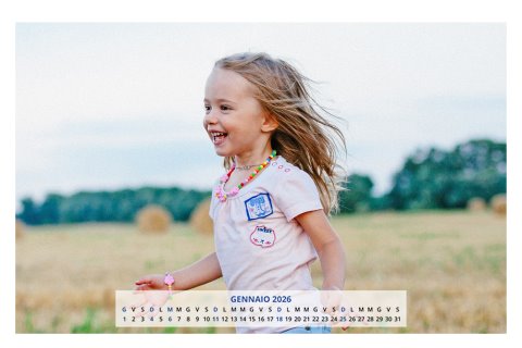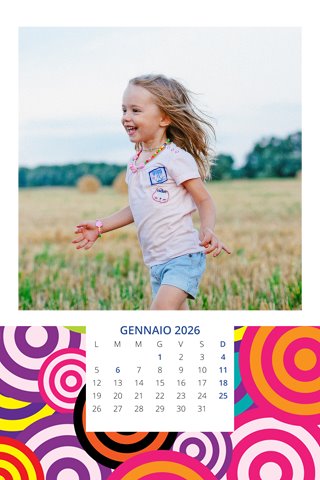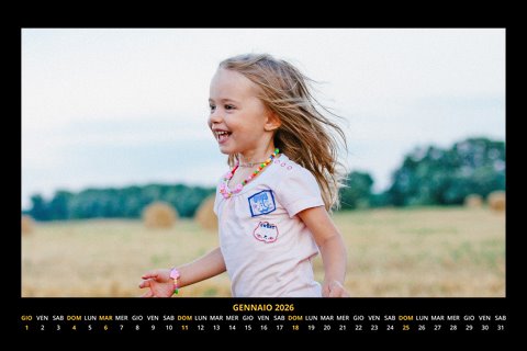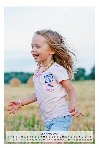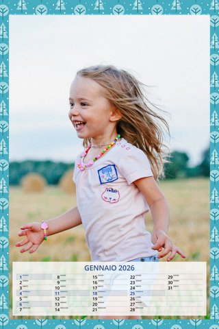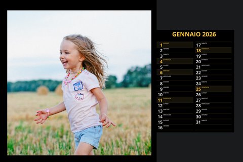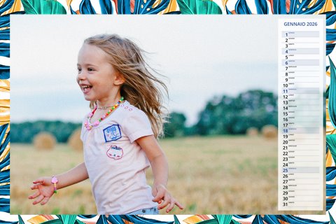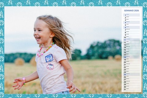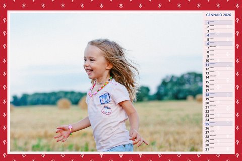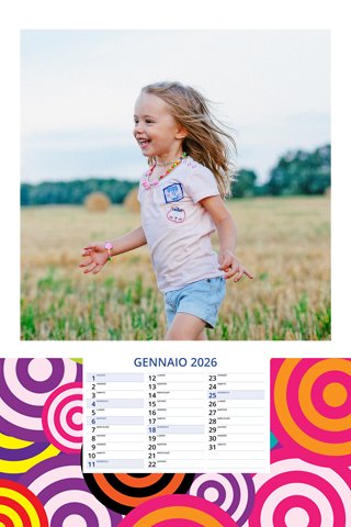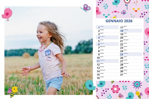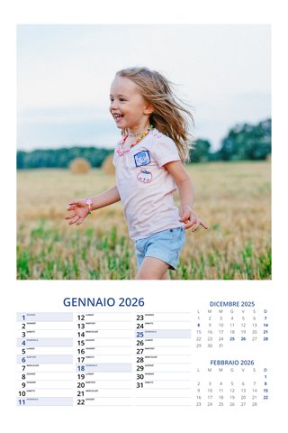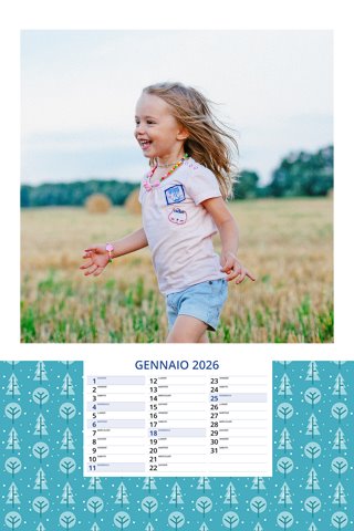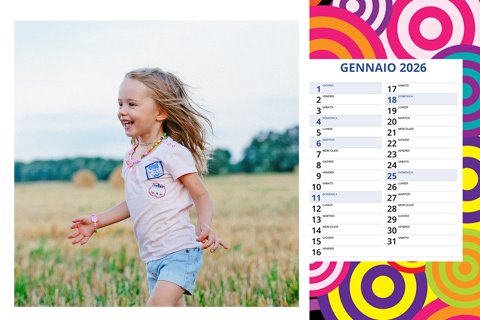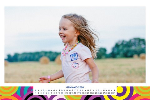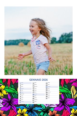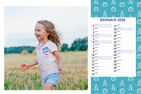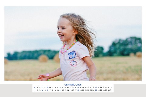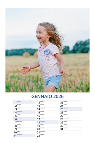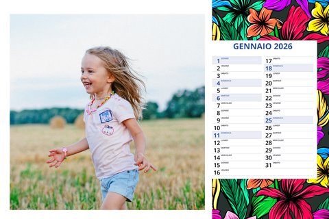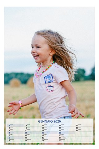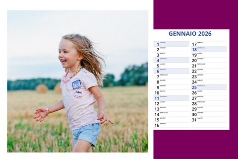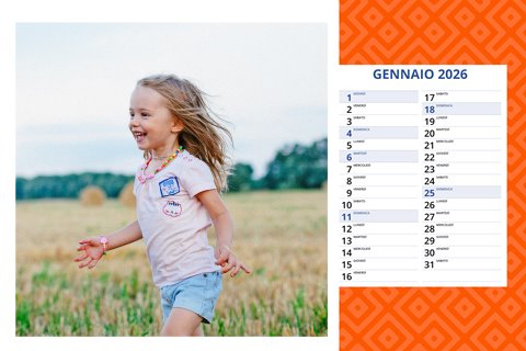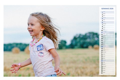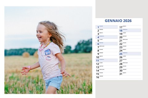 - Opzione “No Grafica” disponibile, per la massima libertà creativa: carica per ogni mese un file con la tua composizione, completa di immagini e datario. Ricorda di rispettare i margini di taglio (2%) e la rilegatura superiore (circa 8 mm).